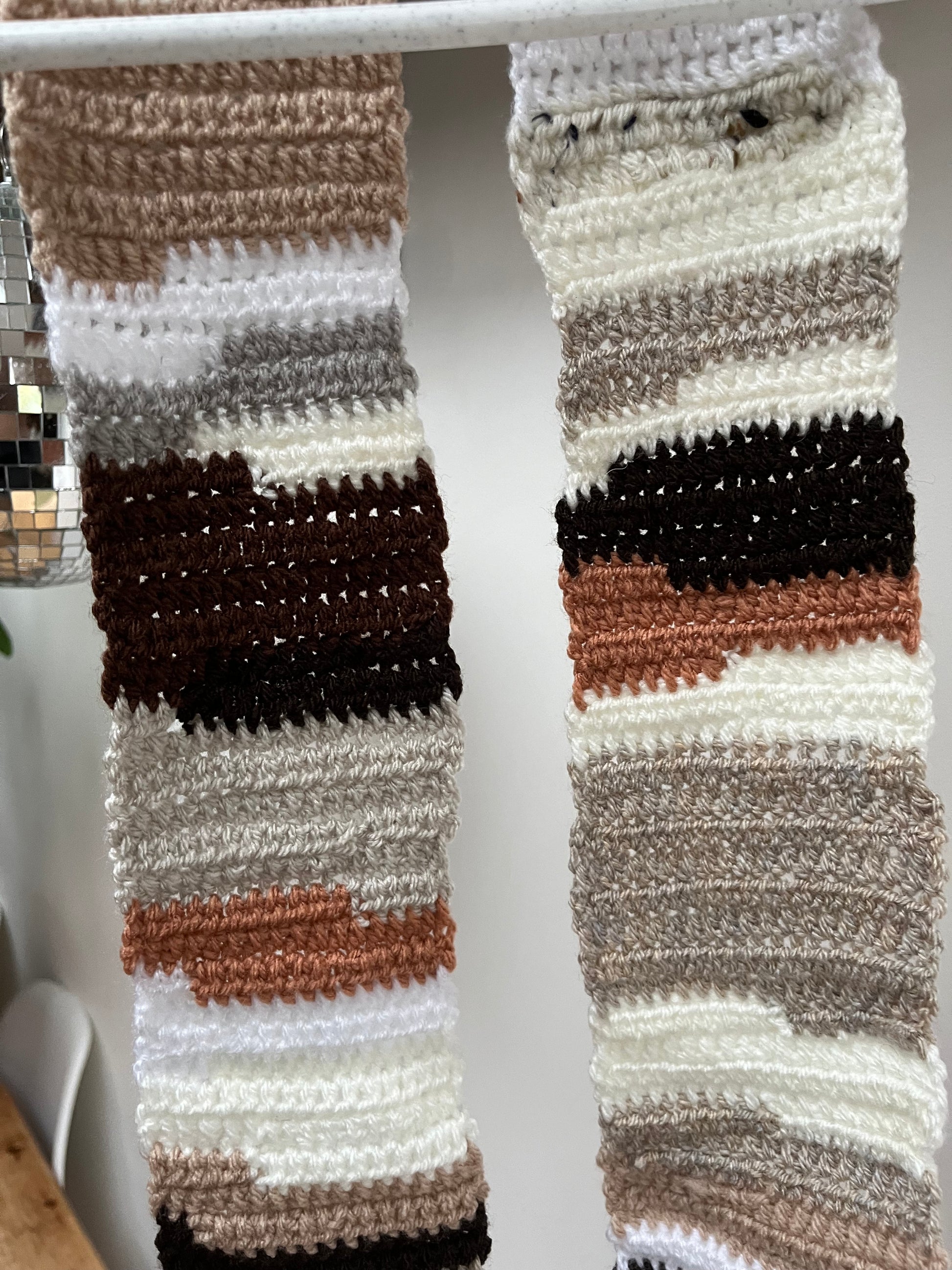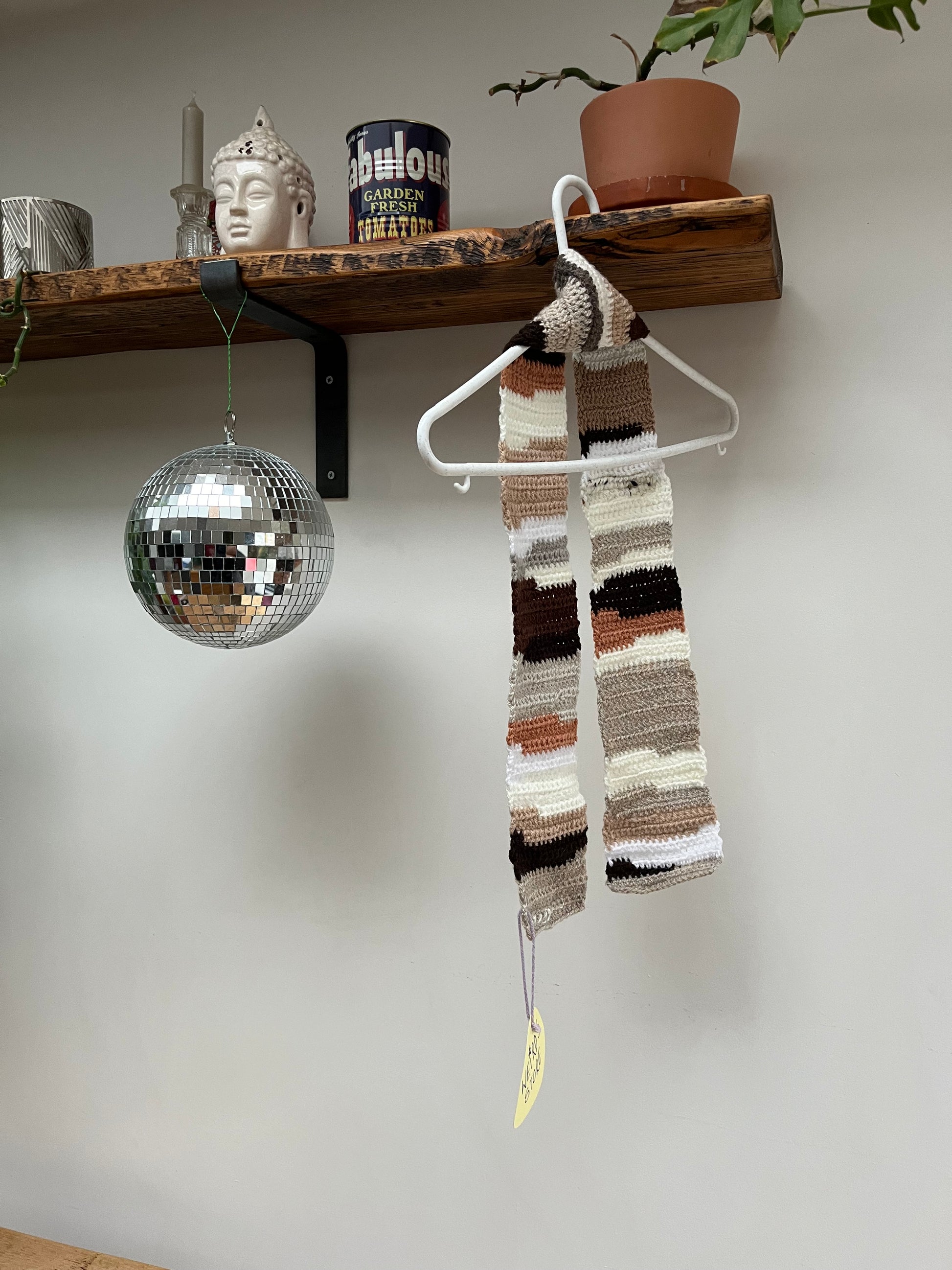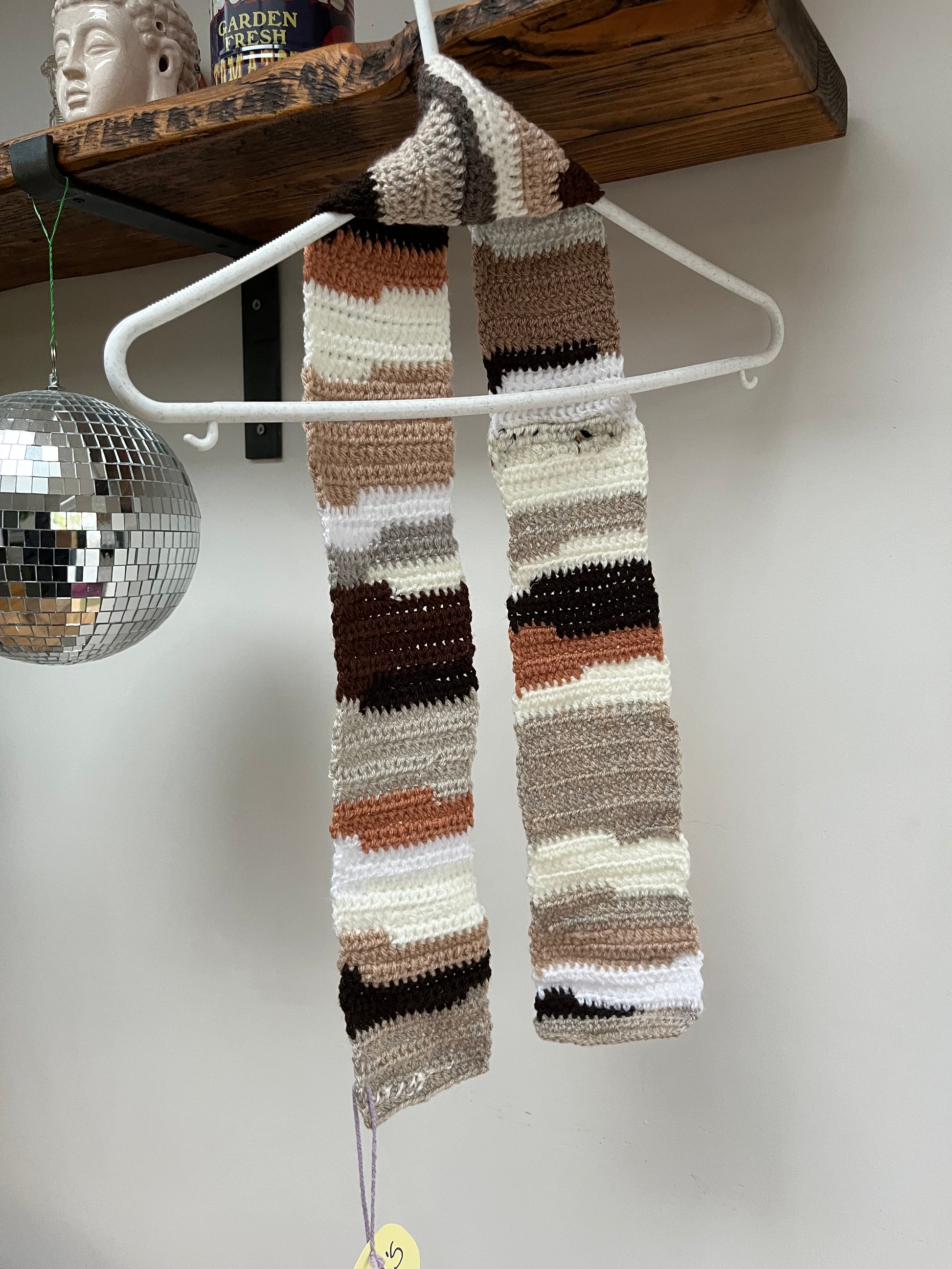 Weird’s store cow print crochet scarf. The range of neutral soft brown and cream organised in a organic order. Perfect for wearing with green, soft pink . Blue and so many more colours .