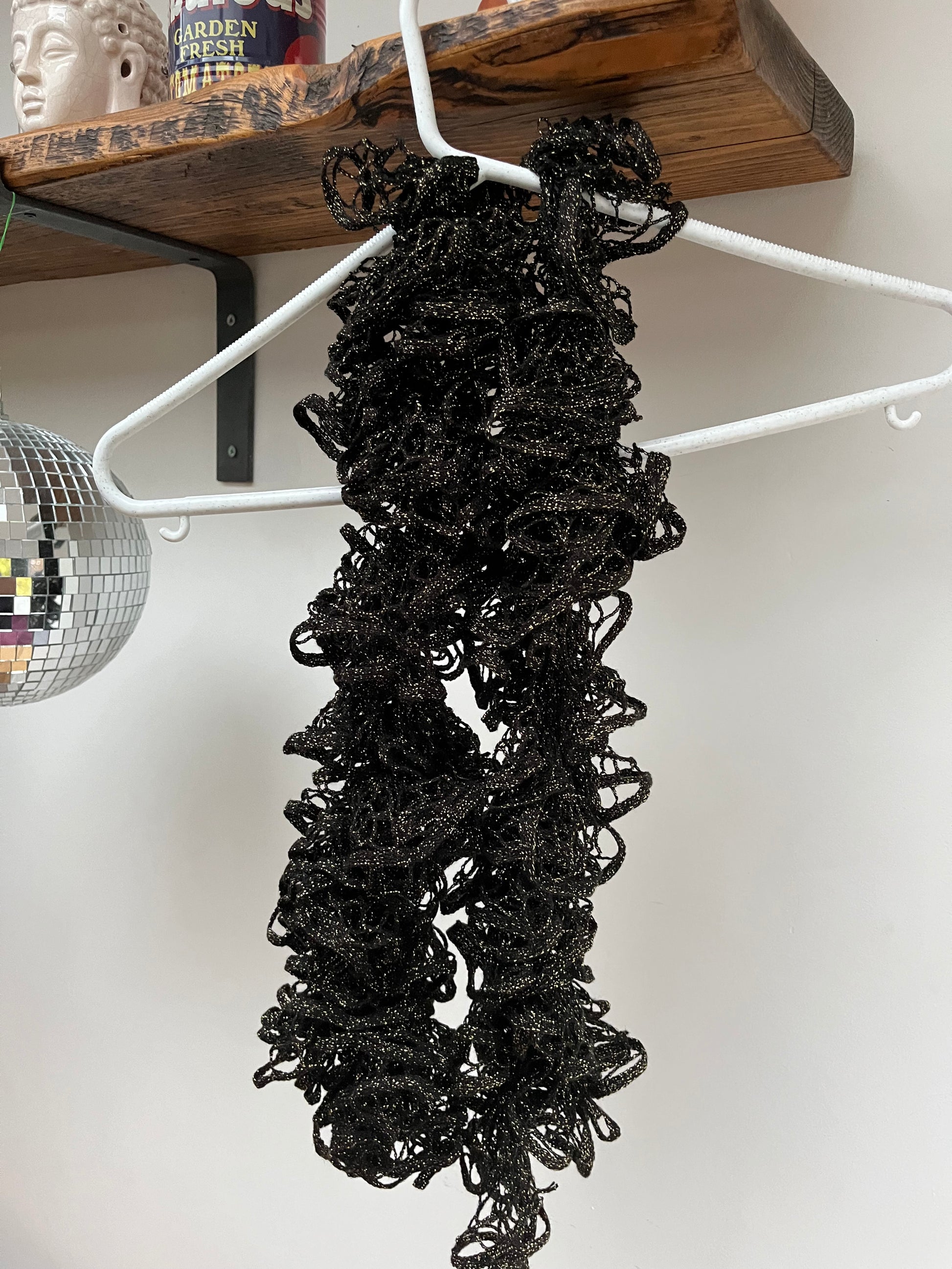 Night shine is our ruffle crochet scarf a sophisticated black and gold colour way to elevate your evening wear without taking away from your fashion but still staying warm. Perfect for an elegant, classy evening event .